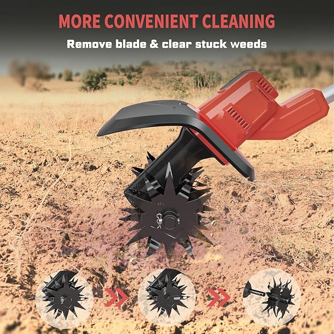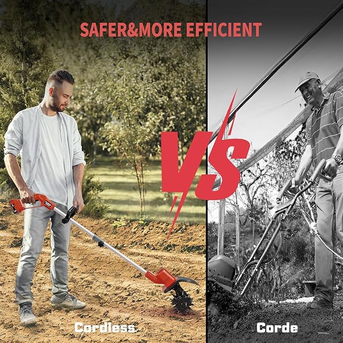 - 【Safety Design】In order to ensure users' maximum safety, the cordless tiller cultivator comes with a safety switch. Only with the simultaneous press of the safety button & trigger of the cultivator, the tiller for gardening could be activated to apply. It ensures that you and your loved ones are always safe from danger. You can use it with peace of mind.