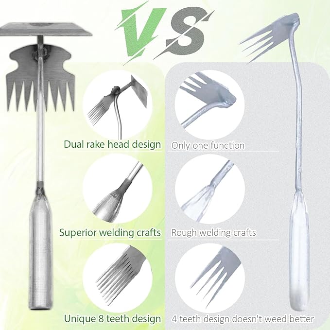 - Efficient Weed Remover for Deep Roots: The sharp hoe edge and sturdy rake tines make this weed remover excellent for tackling stubborn weeds. Easily uproot plants without damaging surrounding flowers, herbs, or vegetable roots