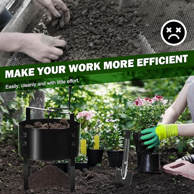 - Stabilized Rocker Arm Design for Smoother Operation: The spring-less rocker arm design will not pop out or shake during use, ensuring stable operation and easy sifting of soil of the desired particle size. The rocker arm is sturdy and durable, still smooth and efficient in long-term use. Warm reminder: The soil should not be poured in more than two thirds of the screen capacity at a time, in order to ensure the best screening effect