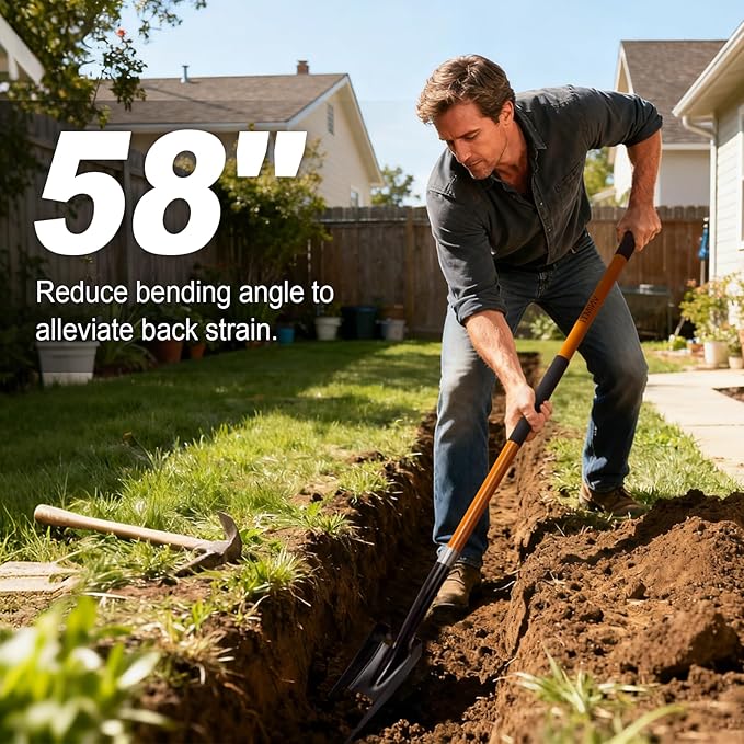 - Dimensions: With a total length of 58 inches and weighing 4.2 pounds, this trenching shovel is designed for adult use. Its ergonomic length reduces bending at the waist during operation, alleviating back strain for more efficient and comfortable gardening.