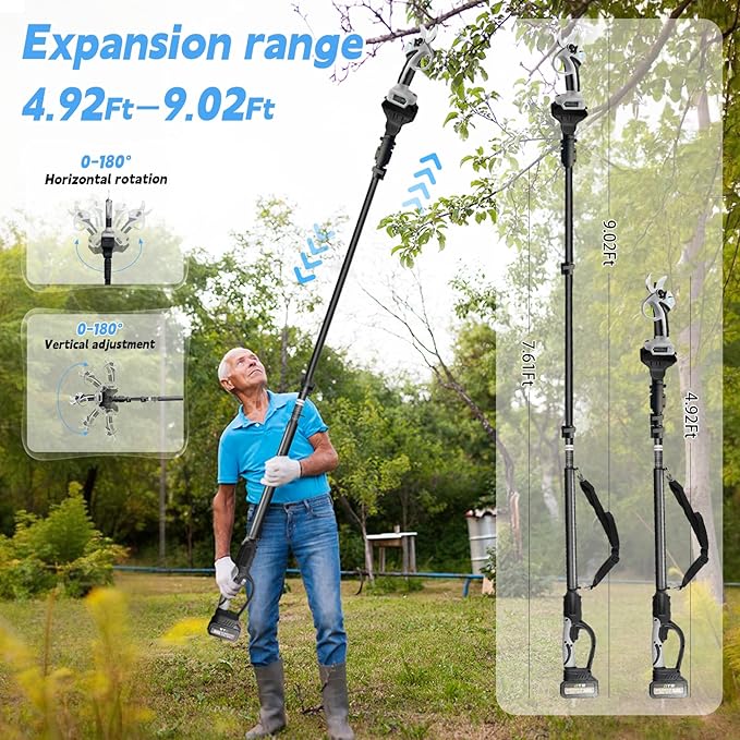 - 【Multiple adjustable Modes】Ground to sky trimming in one tool. With these Electric Pruning Shears, you can effortlessly switch between handheld mode (for low shrubs) and pole mode (extends 4.2 ft to 9 ft). Without a ladder, you can safely prune tall branches from the ground!