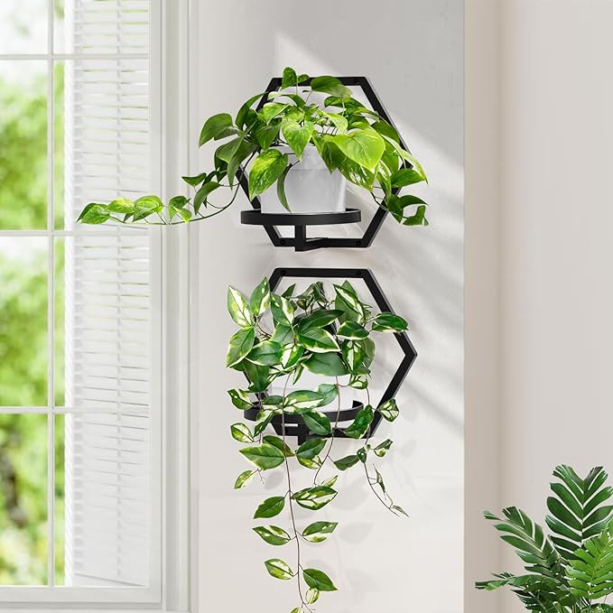 - Modern Design: Our wall plant holder features a unique hexagonal frame design that is stylish and beautiful. The bottom tray has raised edges to prevent planters from falling. Plants and stylish blend perfectly, perfect for plant lovers