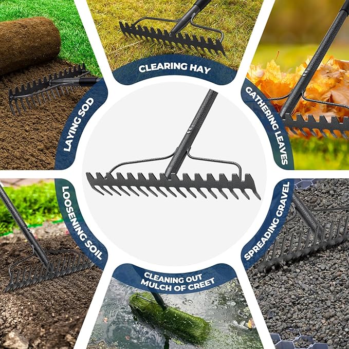- ✅ 【17-inch wide double-sided heavy-duty rake】 Reversible for dual use! Heavy-duty long tines are ideal for handling debris (such as leaves, weeds, gravel, and construction waste), while the short tines are perfect for leveling fine soil and preparing for sowing. Two tools in one, eliminating the need for two separate tools! Twice as fast as a standard rake!
