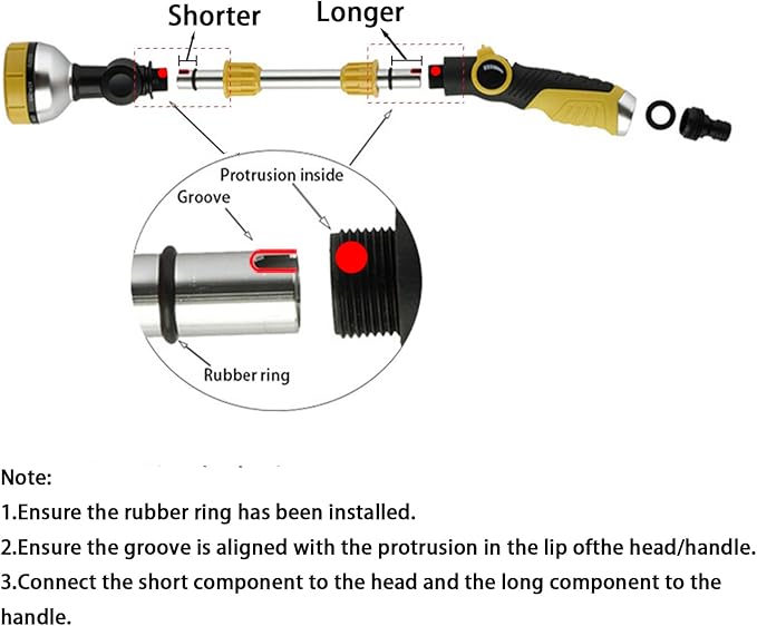 - Simple assembly is required: This 17.5-inch hose nozzle is made of plastic and aluminum alloy. For assembly guidance, please consult the installation diagram and video provided in the main image. An instruction manual is also included inside the packaging box for further reference. Should you have any questions, feel free to contact the seller through private message.