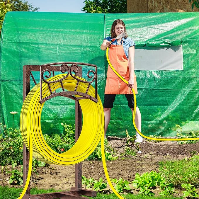 - 【Heavy Duty& Sturdy Hose Stand】 The garden hose hanger is made from heavy-duty steel and coated with a powder finish using an electrostatic spraying process to ensure that it will hold the weight of the hose for a long time without deforming.