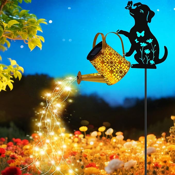 - Perfect Garden Decor For Outside -- Including DOG Metal Shepherd Hook, this solar hanging lights look like an art sparkling on your garden. With gold copper color and hollow out metal veneer, the outdoor patio decor casts warm yellow lights, looking like a string of shining stars pouring down, making it a delightful decoration for pet lovers