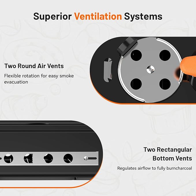 - Excellent Multiple Vent System: Charcoal grills lid is equipped with 2*round vents that can be flexibly rotated to easily exhaust smoke. 2*rectangular base vents that provide continuous airflow to maintain the fire in the charcoal pot to ensure optimal cooking temperatures.