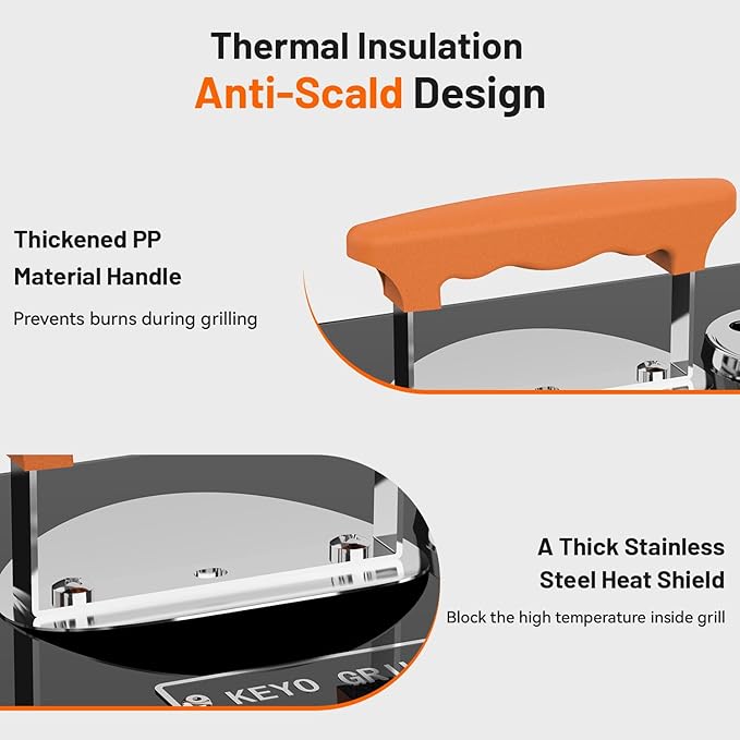 - Heat Insulation Design: Add a layer of thick stainless steel heat insulation plate on the lid, good barrier to high temperature inside the grills. Thickened handle design, prevent burns during the grilling process.