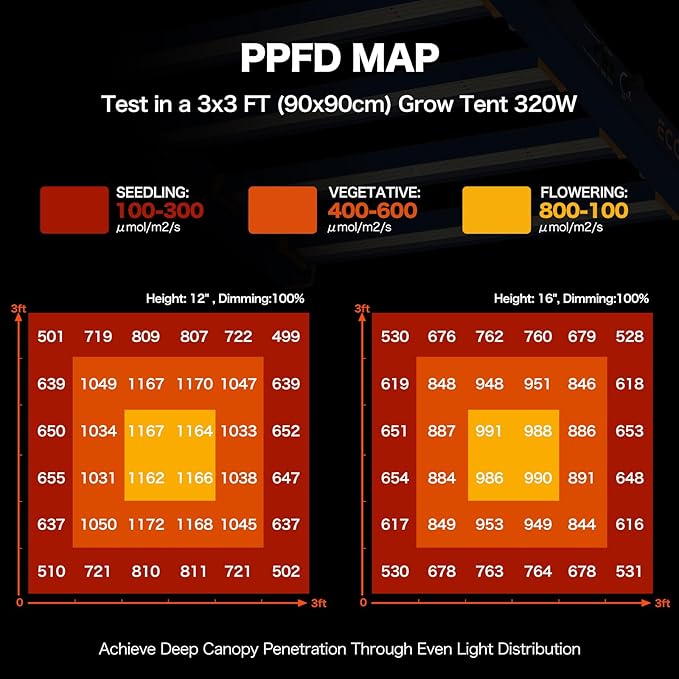 - 【High Efficiency and Energy Saving】 The 320w led grow light is highly energy efficient. market-leading 2.8µmol/J PPE, Max 2.5g yield/watt, 320 watt with smaller footprint for better crop quality, more cost-effective. Our grow light can save more energy while maximizing plant growth and yield.