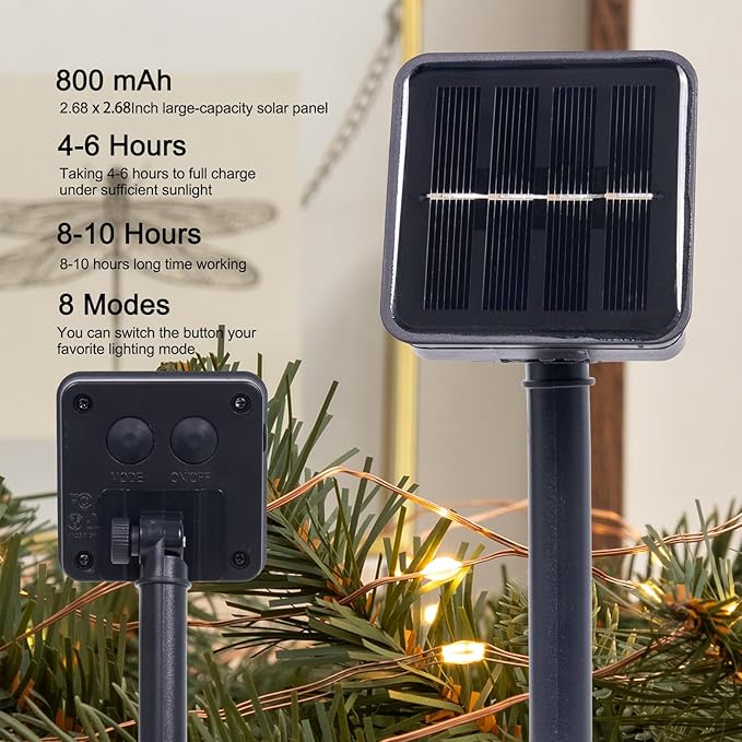 - Effortless Solar Power & All-Night Brilliance:The solar string lights for outside feature a 800mAh battery and premium solar panel, delivering 8-10 hours auto-illumination. Adopting high-efficiency solar panels,it automatically absorbs sunlight and converts it into electricity during the day, no external power supply is needed, energy saving and emission reduction
