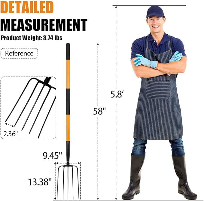 Pitch Fork-58 Inch,5-Tine Steel Garden Fork Heavy Duty, Mulch with Cushion Grip, Orange Fiberglass Handle