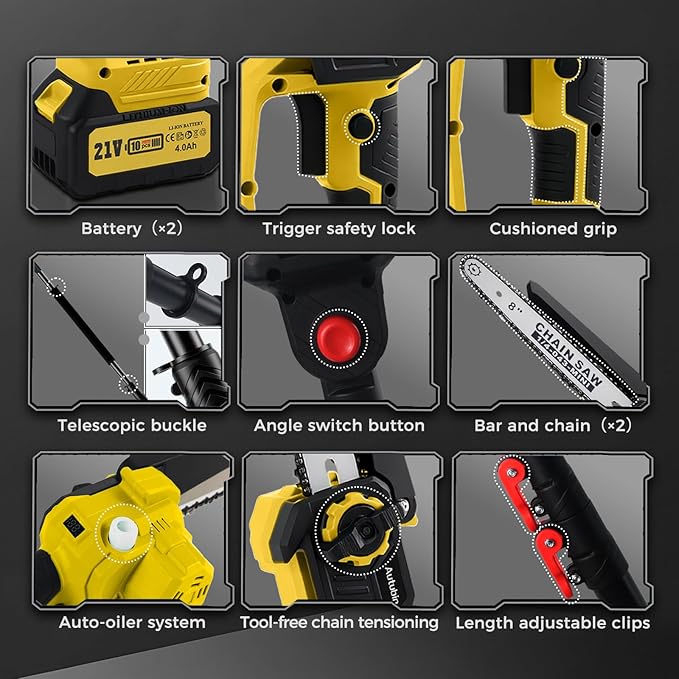 - 【Comprehensive Safety Protection】Features dual safety locks (trigger lock + power lock) to prevent accidental activation, an anti-splash baffle to block wood chips,and anti slip handle ensures safe grip.In addition, gloves and goggles are prepared for you to ensure that you carry out tree pruning work in a safe environment