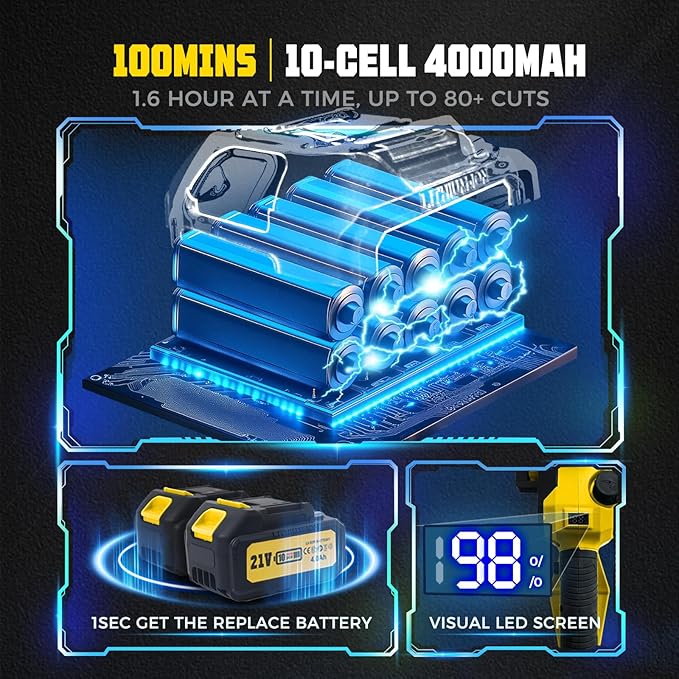 - 【Double Battery - Double Endurance】It comes with 2 packs of 4.0Ah 21V rechargeable Li-ion batteries .Alternating use of dual batteries can trim trees for at least 120 minutes. The product is specially designed with a visual LED screen, which can visually see the remaining power without worrying about the trouble caused by low power.