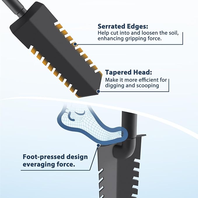 - [Shovels for Digging]The tapered head of the shovel makes it easier to penetrate the soil and remove deep-rooted weeds and grass clumps, while the squared teeth on the edges effectively loosen the soil. The T-shaped handle reduces strain on the back and hands, making prolonged digging more comfortable.