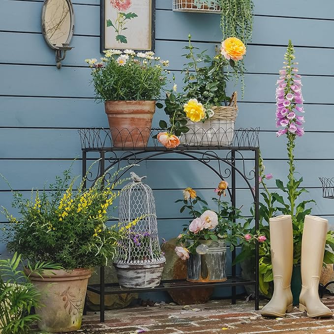 - Intricate Design Details: The delicate scrollwork and the unique scalloped give it a romantic, the black finish adds a sleek, modern touch while complementing the natural tones of your plants and flowers. It’s not just a plant stand, it’s a decorative piece that enhances the overall aesthetic of your outdoor living space