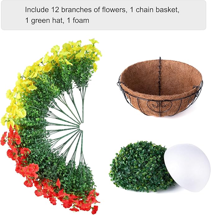 - Size & Effortless Assembly: The artificial hanging baskets support easy DIY assembly—only 5 minutes needed! Simply place the faux flower branches into the basket and shape it into your desired look. The fake hanging baskets size after assembly is approximately 19.6" x 19.6" x 20.5"(LxWxH); The hanging basket measures 12 " x 12" x 6 "(LxWxH) and the chain length is 13.78 inches.