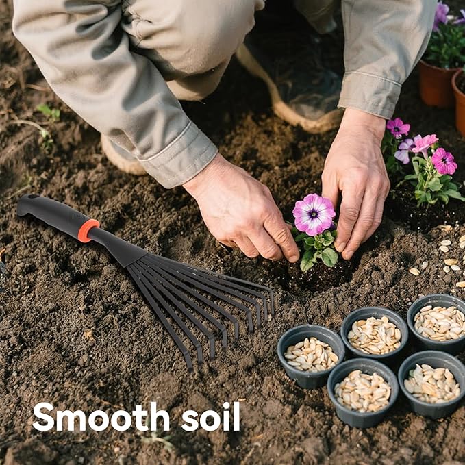 - Ergonomic Easy Grip Handle: Designed with user comfort in mind, the ergonomic handle provides an easy grip, allowing you to use the small fan rake for extended periods without discomfort while tending to your flower beds.