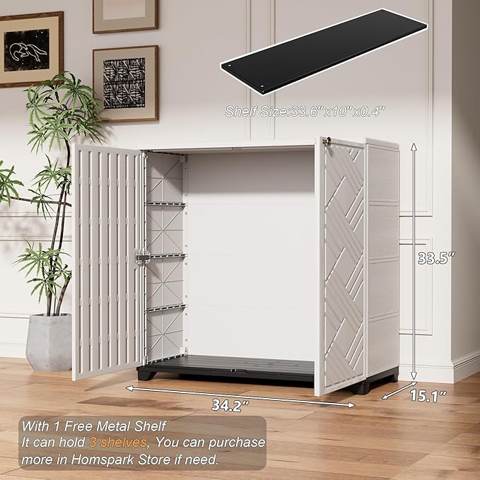 HOMSPARK Indoor/Outdoor Storage Cabinet with Doors and 1 Shelf, 34”x15”x34” HDPE Plastic Storage Box for Patio, Garden, Enterway, Balcony, Multi-Purpose for Daily Tools, White
