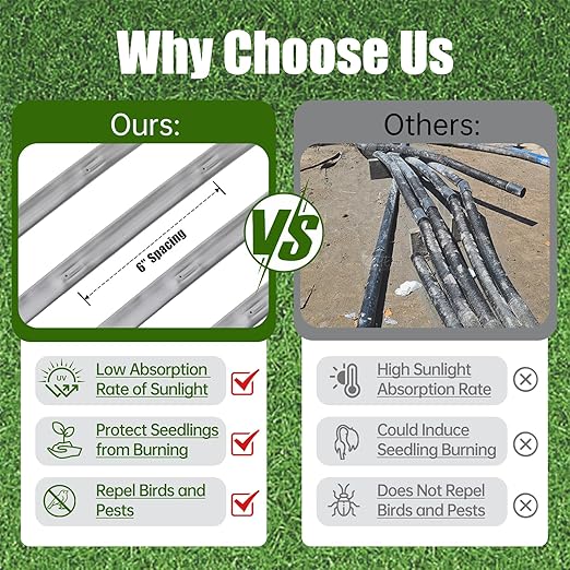 - Silver Drip Irrigation Tape: Our light-colored drip irrigation tubing has a low absorption rate of sunlight, which prevents the drip irrigation pipe from scalding plants or seedlings. It also has a repellent effect on birds and pests, effectively protecting against bird pecks and insect bites