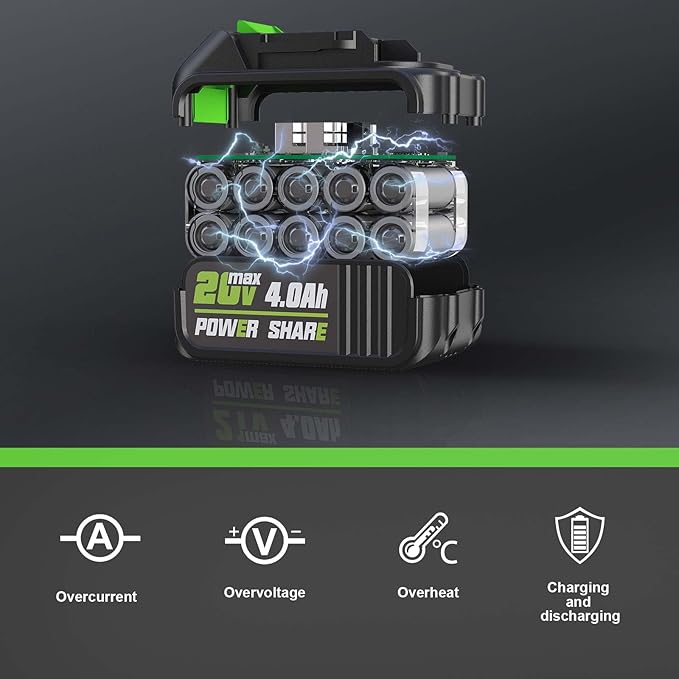 - 2 x 4.0Ah Batteries System- Cordless leaf blower is equipped with two 20V Max 4.0Ah lithium-ion batteries, with a maximum running time of more than 120 minutes, and can last for more than 60 minutes even at the highest wind speed, effectively extending the battery life.