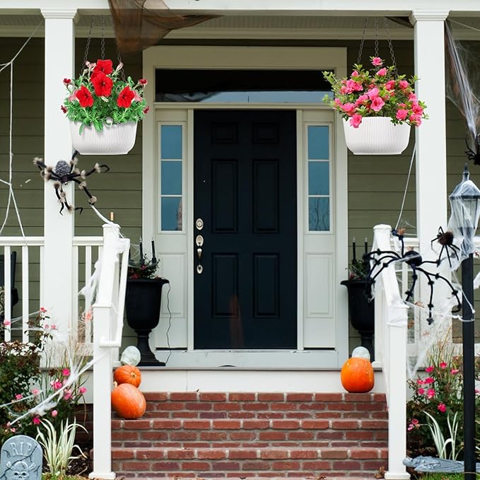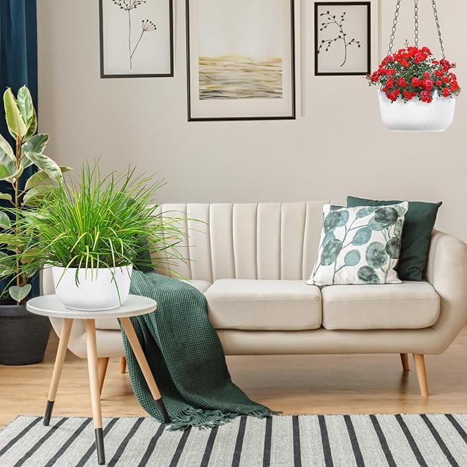 Set of 2 White 10 Inch Hanging Planters for Indoor Outdoor Plants, Self Watering Hanging Flower Pots with Drainage Hole & Plug