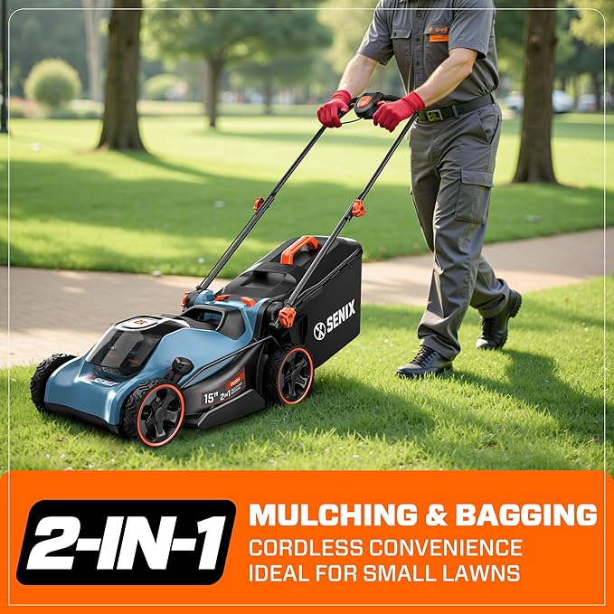 SENIX 40V 15'' Cordless Lawn Mower - 1.3 Bushels Grass Bag, (2) 4Ah Batteries & 3.0A Charger Included