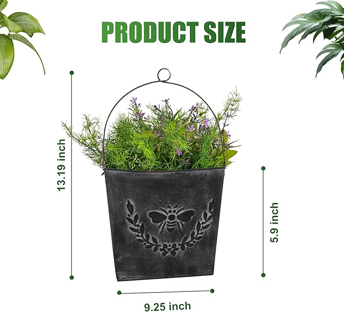 CVHOMEDECO. Farmhouse Wall Mount Metal Flower Pots Rustic Galvanized Bee Flower Holder Wall Hanging Pocket Planter for Indoor, Outdoor and Wall Decor, Set of 2 (Matt Black)