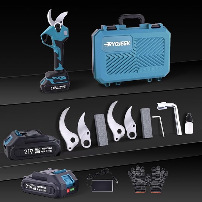 - You Will Receive -1× electric garden shears,2×2.0Ah batteries,a fast charger,3 sets of blades,2 oilstones,a pair of gloves,a set of blade changing tools,1 oil bottle,1 user manual,and 1 portable plastic box.If you encounter any product problems during use,please feel free to contact us at any time.Ryojegk will solve your problem within 24×7