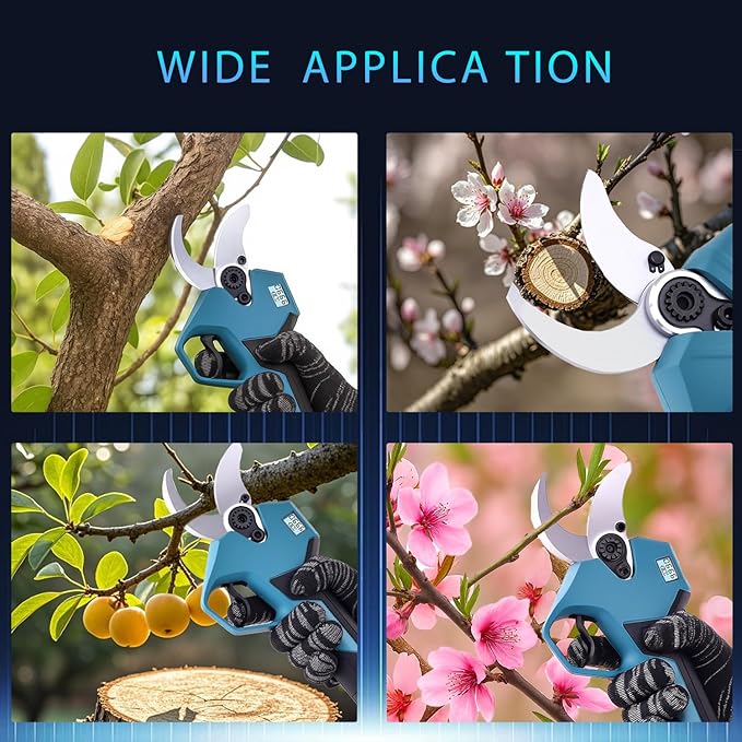 - Professional-Grade Cutting Performance - The RYOJEGK cordless pruning shears,equipped with an upgraded brushless motor,can easily prune branches with a diameter of 1.6 inches (40 mm),providing 1000W of power for smooth and fast cutting.The maximum opening of 2.5 inches (65 mm) ADAPTS to different branch sizes,from fragile stems to tough woody growth.SK5 high-carbon steel blades remain sharp for a longer time,are rust-proof and wear-resistant - ideal for orchards,vineyards,and heavy gardening