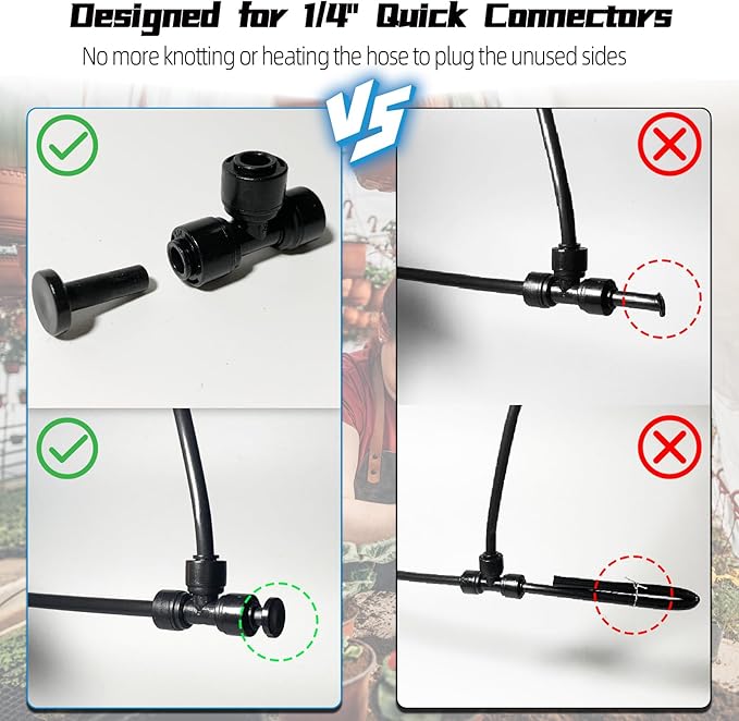 - Package Includes: 10pcs 1/4" Tee Connectors, 10pcs 1/4" Coupling Connectors, 10pcs 1/4" Elbow Coupling Connectors, 5pcs 1/4" Drip Irrigation Shut Off Valve, 10pcs 1/4" End Plugs for 1/4" Quick Connect Drip Irrigation Fittings.