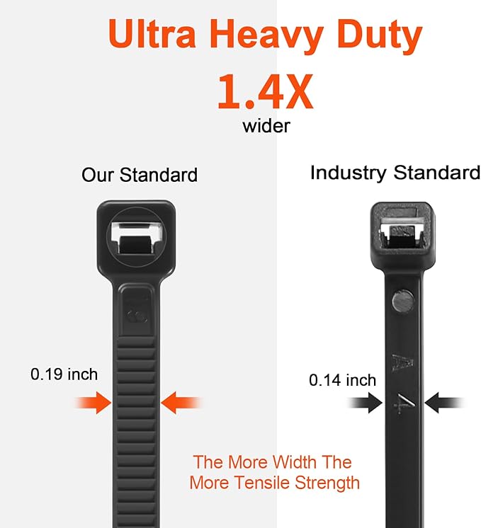 - 【100lb Tensile Strength】: The more width and Thickness, the more tensile strength. our zip ties 18 inch width is 0.19 inch(4.8mm), while industry standard is 0.14 inch(3.6mm), our zip ties 18 inch Thickness is 0.065" inch(1.65 mm), while industry standard is 0.05 inch(1.25mm),more tensile strength.