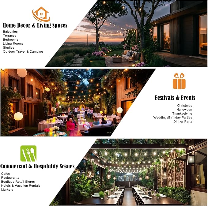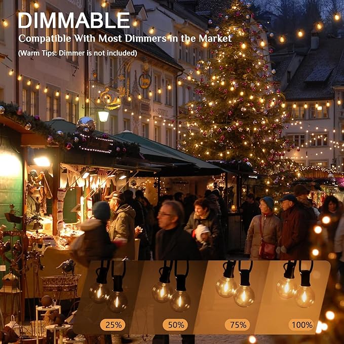 - High Compatibility, Sufficient Configuration & Versatile Scenes:Features a standard E12 socket base, compatible with any same-spec string lights. This 25-feet G40 LED globe string light comes with 25 clear plastic LED bulbs and 2 spares. Emits warm white light, perfect for gardens, tents, courtyards, bedrooms, adding romance to various events