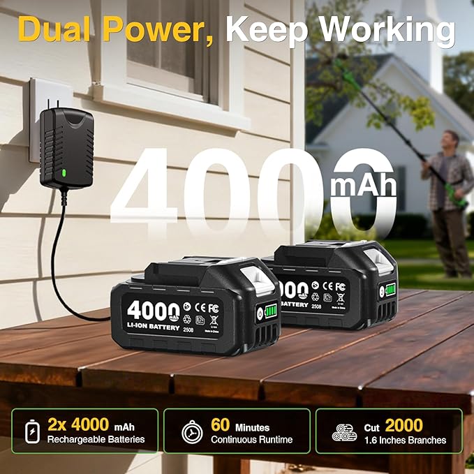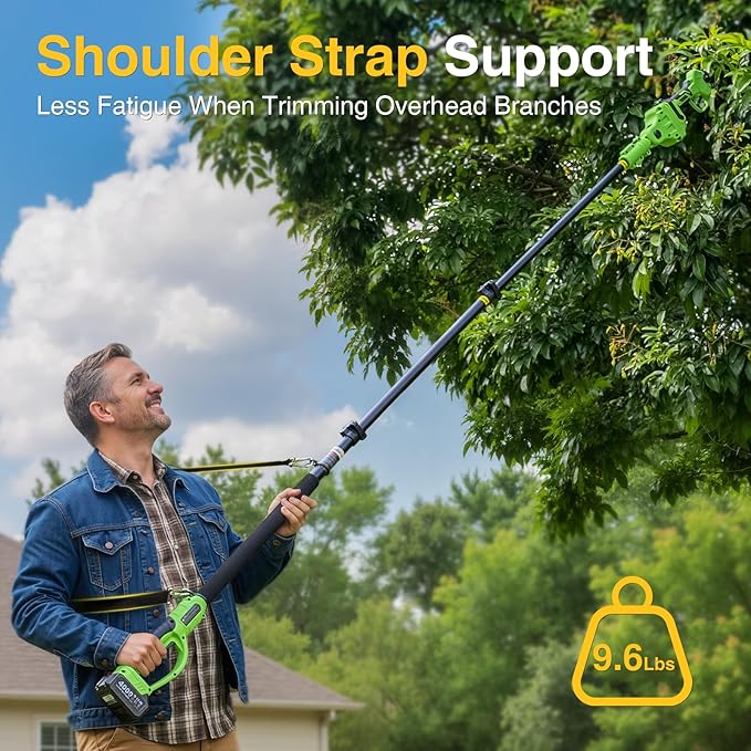 - High-Efficiency Brushless Motor: The advanced brushless motor makes the pole pruning shears run smoother, quieter, and more durable; It delivers strong cutting power with less wear and noise, ensuring efficient, reliable, and comfortable pruning work