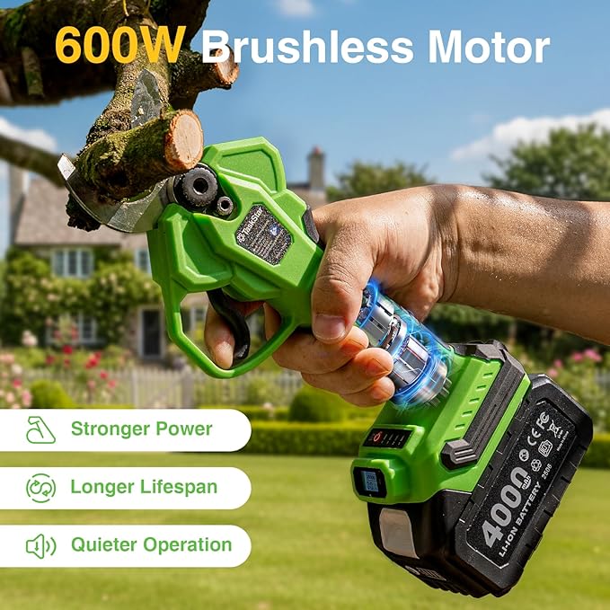 - Long-Lasting Battery Life: Powered by two 4000mAh rechargeable batteries, this cordless pruner supports up to 2000 cuts per charge; Work longer without worrying about running out of power, perfect for large yards, orchards, and all-day pruning tasks