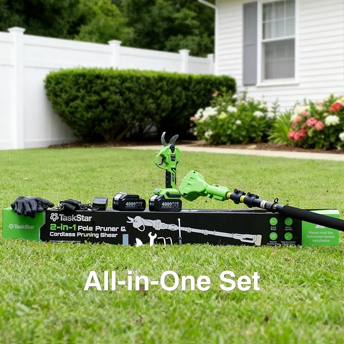 - Package Include: 1 x TaskStar electric pruning shears; 1 x telescopic pole; 2 x 4.0Ah batteries; 1 x fast charger; 1 x SK5 replacement blade; 1 x shoulder strap; 1 x sharpening stone; 2 x hexagonal screwdriver; 1 x screwdriver; 1 x hexagon wrench; 1 x glove; 1 x manual