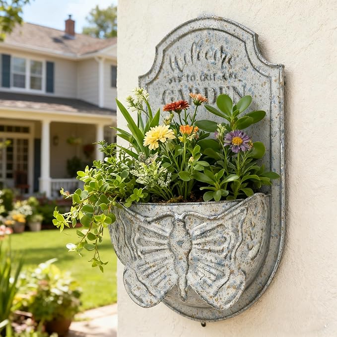 Rustic Metal Wall Planter with Butterfly Design, Welcome to Our Garden Hanging Flower Pot for Outdoor Indoor Decor, Vintage Galvanized Plant Holder for Patio, Porch, Garden