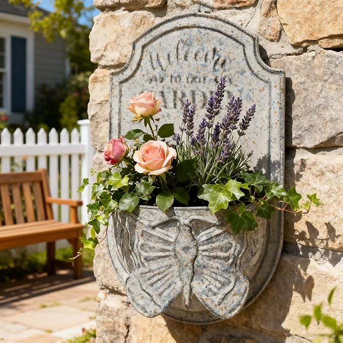 - 【CHARMING RUSTIC & VINTAGE AESTHETIC】Features a distressed galvanized metal finish with blue and bronze speckles, plus an embossed butterfly design and "Welcome to Our Garden" inscription. Adds nostalgic charm to any space, blending seamlessly with farmhouse, cottage, or boho decor styles.