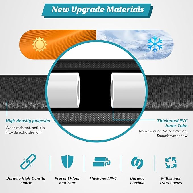 - Leak-Resistant Construction for Long-Lasting Use: Made with thickened PVC material and high-density fabric, this garden hose provides reliable strength and wear resistance. It resists punctures from sharp objects and easily navigates around trees, grass, and walls, helping to prevent leaks and ensuring reliable performance over time.