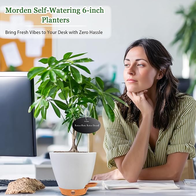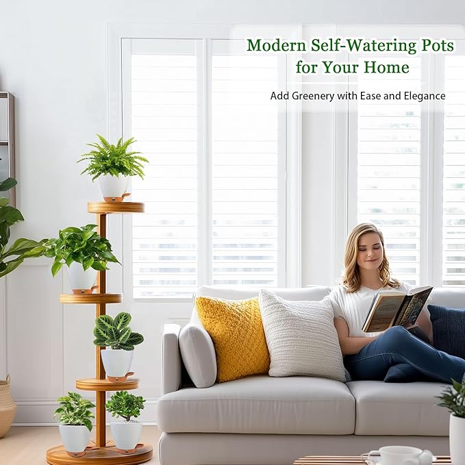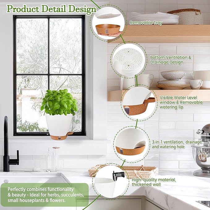 - 🌿 Self-Watering System with Water Level Indicator 🌿 Never overwater or underwater again! Our 6 inch self-watering pots feature an absorbent cotton wick system that draws water automatically from the detachable tray. The unique transparent water level window lets you monitor hydration at a glance—ideal for vacations or busy schedules, keeping soil evenly moist for up to5-7days. These indoor plant pots with drainage take the guesswork out of plant care.