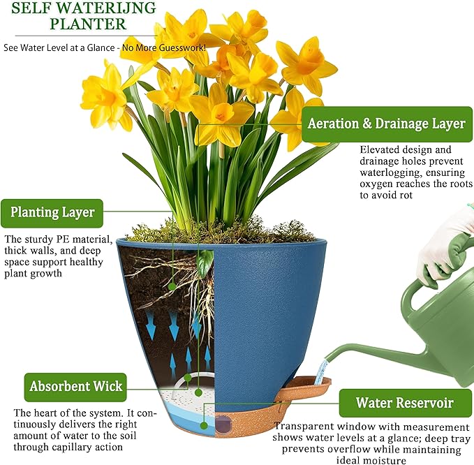 - 🌿 Self-Watering System with Water Level Indicator 🌿 Never overwater or underwater again! Our 6 inch self-watering pots feature an absorbent cotton wick system that draws water automatically from the detachable tray. The unique transparent water level window lets you monitor hydration at a glance—ideal for vacations or busy schedules, keeping soil evenly moist for up to5-7days. These indoor plant pots with drainage take the guesswork out of plant care.