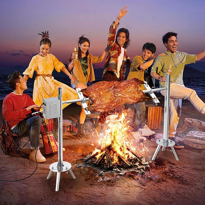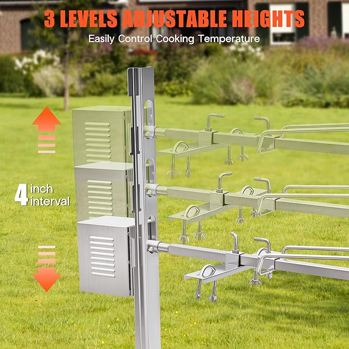 - Stability: Designed with triangular support legs, rotisserie unit remains stable even on uneven ground like grass. The locking column structure ensures faster setup and prevents loosening under high heat