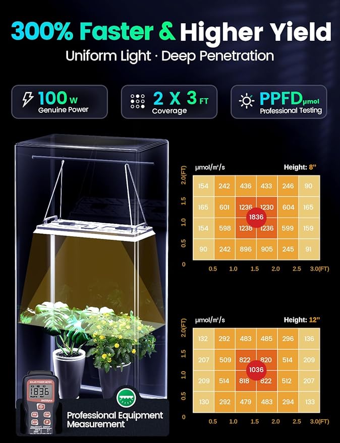 - 100W LED, 2x Growth Rate: Unlike other products with overstated specifications, our Smart Plant Light is equipped with a full-power 100 watt LED that offers 8 adjustable brightness levels and a patented light spectrum. It delivers impressively high PPFD performance, facilitating up to 200% faster growth compared to traditional plant lights. With a 2x3 ft coverage area, it significantly enhances your gardening productivity!