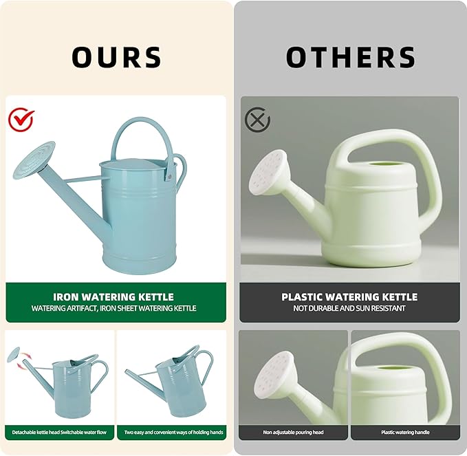 - Multi-functional Design Design: Watering can with a detachable shower nozzle, gives you the option for a gentle shower or steady stream, it pours smoothly with no drips or mess. Ergonomic construction, with a comfortable handle that makes plant watering effortlessly.