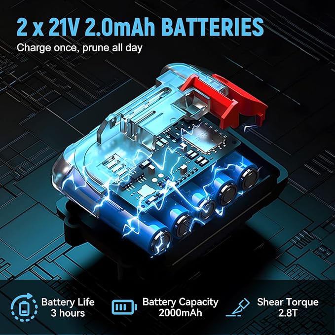 - 【21V 2000mAh BATTERY*2 & FAST CHARGER】Powerful and long-lasting! This electric pruners cordless includes two 2000mAh batteries, each charges fully in 1-2 hours and provides 6-8 hours of continuous use. allowing for over 2,400 cuts (2 x 1200). Your electric shears for gardening no need to charge frequently!