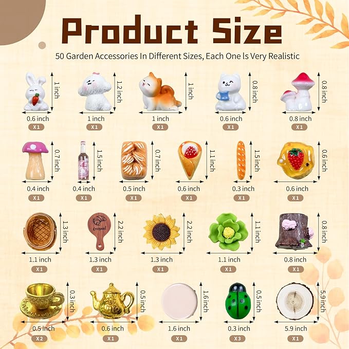 - Fantasy Garden Kit: Our miniature fairy garden set have 50 pieces, including a little large wooden stake base, plus animals, mushrooms, trees, stones, bugs etc in this kit. This set is perfect for novice gardeners, offering a fun and simple way to create an enchanting garden