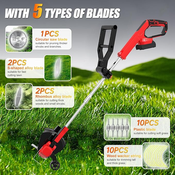 - 【Deluxe Accessories 】2025 Newest upgraded weed whacker set includes: 1 x Cordless Weed Trimmer; 2 x 2000mAh Batteries; 1 x Saw blades; 2 x Rhombus alloy blades; 2 x S-alloy blades; 10x Weed wacker string; 10 x Plastic blades; 1x User manual; 1 x Wheels; 1 x Fast charger; 1 x Gap Mower;1 x Protective work Gloves; 1 x Safety goggles. The perfect combination makes you enjoy your gardening work more