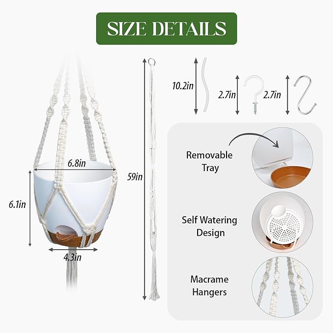 - 【Perfect Hanging Planters for Indoor Plants】The set includes 1 Tier macrame plant hanger, 2 plastic self watering plant pots and saucers, and 2 hooks