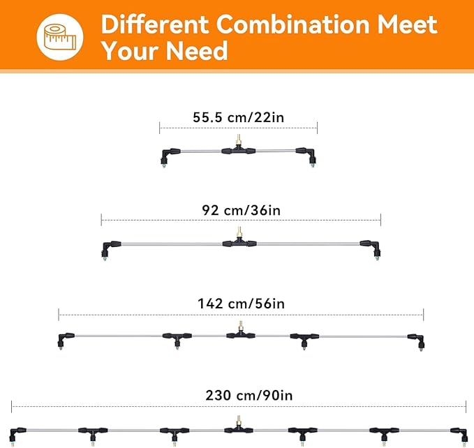 - 【3-in-1 Assembly Flexibility】Customize your sprayer boom in seconds: Build a 90-inch 6-nozzle wand for large fields, a 56-inch 4-nozzle setup for gardens, or a compact 36-inch 2-nozzle unit for targeted spot treatment.