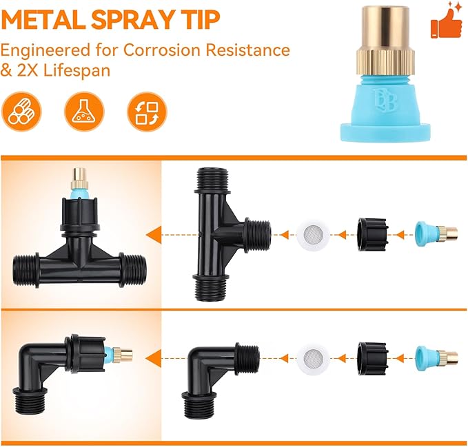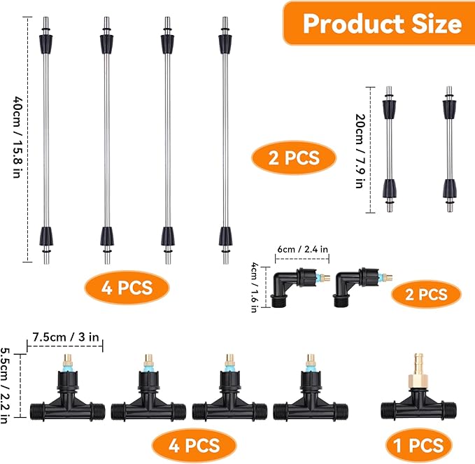 - 【6 Adjustable Metal Nozzles】The boom wand kit comes with 6 brass nozzles that can be easily rotated and adjusted, providing a customizable spray range from a powerful jet stream to a gentle mist spray, suitable for a variety of tasks—from watering delicate plants to treating large areas.