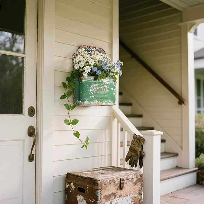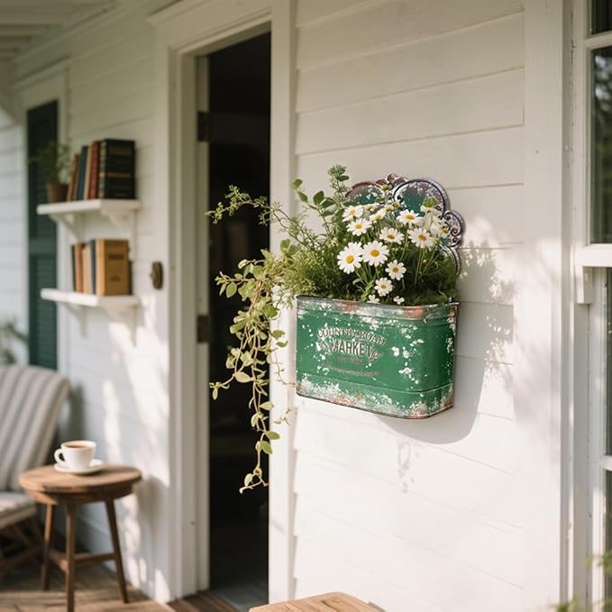- HANGING WALL BASKET: Rustic metal wall planter featuring a distressed green finish and 'Country Road Market' embossing, perfect for farmhouse-style decor